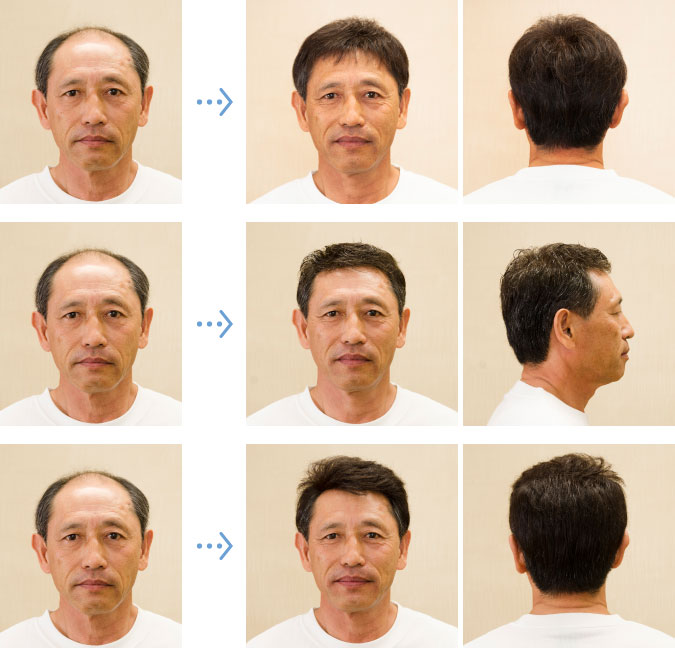 頭の型取りをし、希望の髪の色にあつらえたカツラを希望の髪型にカットしていきます。